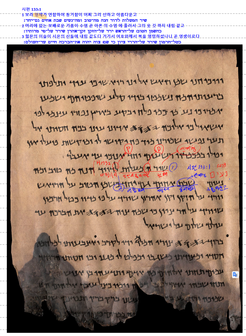 위 본문은 시편 133:1"다윗의 시, 성전에 올라가는 노래"의 본문을 담고 있는 사해 두루마리 원본이다.