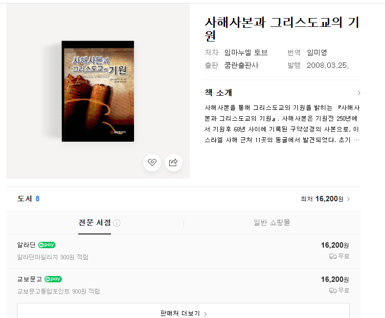 논문들을 모아 놓은 책인듯하다. 내용이 참신하고 처음 사해 사본에 대한 접근에 대한 개념을 이해 하는데 많은 도움이 될 만한 책이다. 특히 한 사람의 글이 아닌 여러 전문가 분들의 견해를 엿 볼 수 있어 참 좋았다.