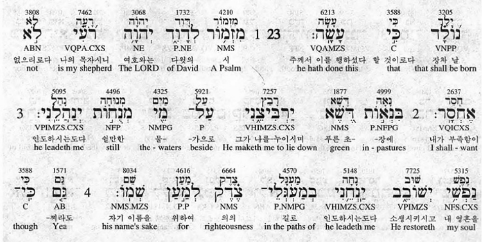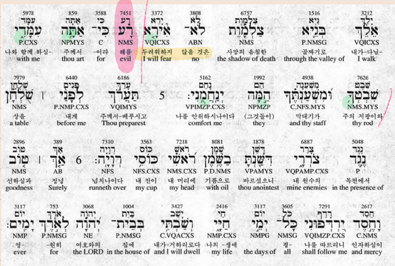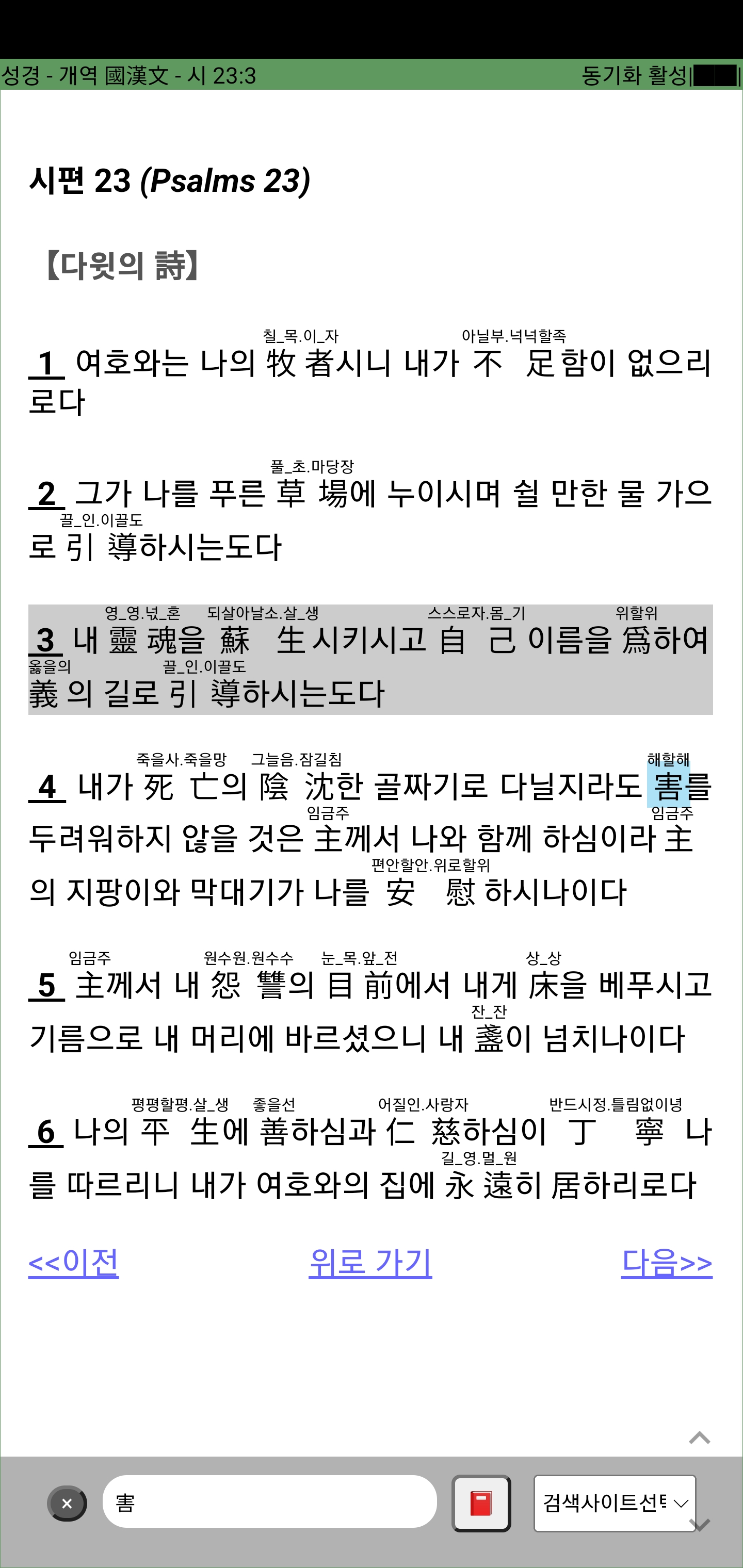 한글성경은 번역 당시 한자 문화 속에서 번역되어 기록된 것이기에 시편 23:4과 같이 한글로는 해지만 한자로는 해로운 것으로 풀어 이해 해야한다.
