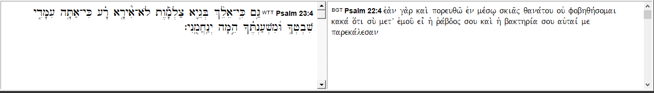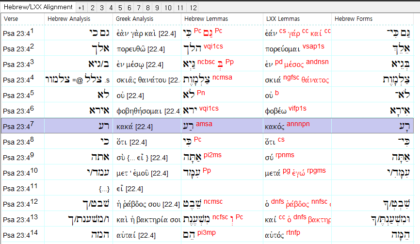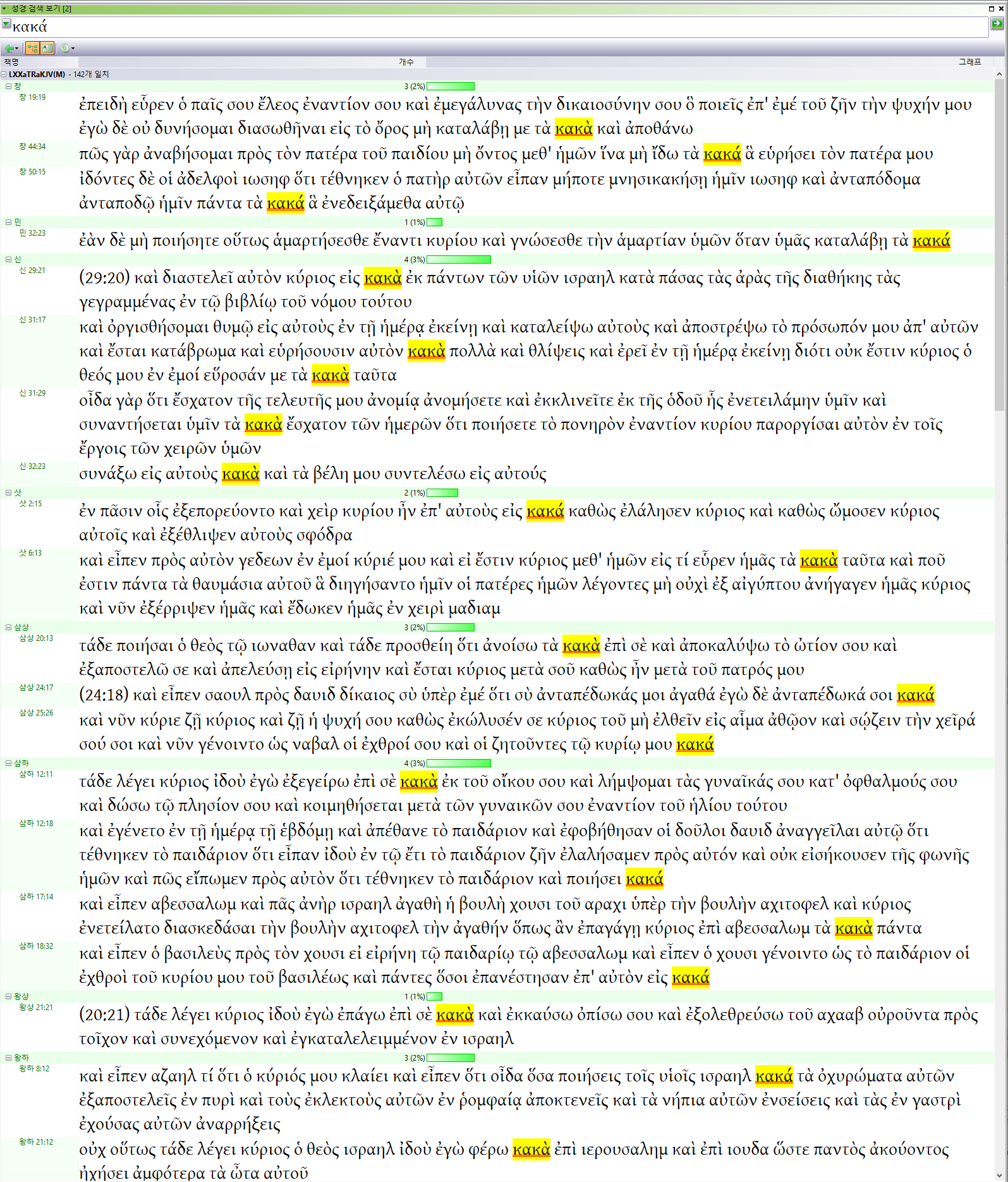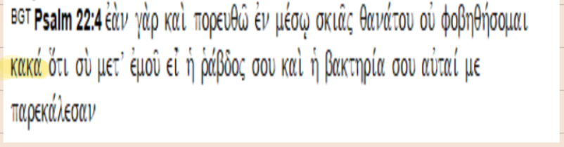 위의 한글 용례들 중 시편 23:4에 나타난 κακὰ가 사용된 Lxx의 용례를 다시 찾아 보았다. 아래의 용례와 위의 용례의 중복을 확인하면 창 19:19에 κακὰ 가 사용된 것을 확인할 수 있다. 창 19:19에서는 "재앙"으로 한글성경에서 번역되어 있다.