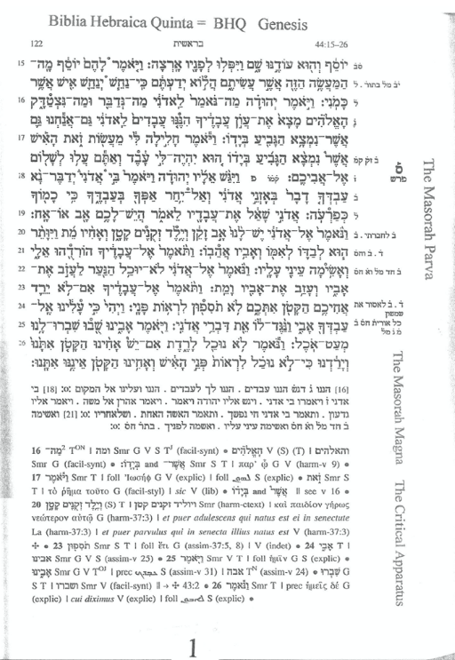 이 논문에서 나는 Abraham Tal이 편집한 창세기 에서 가장 최근에 인쇄된 BHQ 책의 샘플 페이지를 예시 목적으로 사용하여 이러한 새로운 기능 네 가지를 모두 간략하게 조사할 것입니다 . 아래에 재현된 선택은 애굽에 있는 요셉의 형제들과 관련된 창 44:15-26과 베냐민의 석방을 위해 요셉에게 유다가 호소하는 내용에서 나온 것입니다. 이미지에서 페이지 오른쪽의 히브리어 텍스트 옆에 Mp 메모가 기록되어 있고 Critical Apparatus 바로 위의 히브리어 텍스트 아래에 Mm이 인쇄되어 있는 것을 볼 수 있습니다. 이러한 섹션은 페이지 오른쪽 이미지에도 강조 표시되어 있습니다.