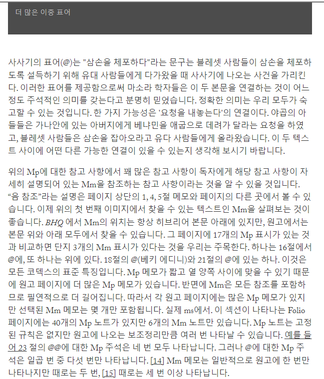 BHQ가 ms에 나타나는 이중 표어를 녹음하여 또 다른 혁신을 도입한 것은 Mp 노트에 있습니다 . 이중선(두 번 나타나는 형태)의 대부분은 단순히 문자 ב로 표시됩니다. 예를 들어 @(@)에 관한 18절의 형식이나 20절의 @를 보십시오. 그리고 이 페이지에 더 많은 내용이 있습니다. 편집자는 대부분의 메모에서 두 번째 참조가 나타나는 위치를 표시했습니다. 그러나 마소라는 실제로 두 번째 구절이 나오는 곳을 가리키는 또 다른 이중어 그룹이 있는데, 이는 두 번째 구절에 나오는 단어인 표어를 사용하여 이를 나타냅니다. 이것을 이중 표어라고 하며 BHQ는 이전 Biblia Hebraica 판( BHK [11] = BH 3 또는 BHS ) 에는 출판되지 않았던 이중 표어를 처음으로 학계 대중에게 선보였습니다 . 우리 섹션에는 그러한 이중선이 두 개 있습니다. 하나는 20절에 @(웨얄라드) 형태로 되어 있다. 여기에는 "두 번"으로 읽은 Mp 음표 ב가 있고 그 뒤에 @라는 형식이 나옵니다. 이 형태 @(@)는 주석의 주제인 @(@) 형태가 성경의 다른 곳에서 발견될 수 있다는 것을 나타내는 표어이다. 이 표어 @(레메크)는 창 4장 23절(레멕의 자랑을 포함하고 있음)에서 나왔고 그것이 @의 두 번째 출현이 발견되는 절이다. 따라서 이중 표어는 두 텍스트를 하나로 묶는 역할을 하며, 따라서 성경 주석에 유용할 수 있습니다. 실제로 이러한 표어는 13~14세기 중세 성서 주석가 Jacob ben Asher(1269~1343년 Baal Tur라고도 알려짐)가 토라에 대한 주석에서 설교 목적으로 사용했습니다. [12] 따라서 여기와 창 4장 23절에 나오는 이중 단어 @에 관하여, 표어 @가 나오는 곳에서 ben Asher는 여기 우리 본문에서 @의 두 발생이 @@이슬로드에 있다고 논평한다. ָן “그리고 의 어린 아이 그의 노년기”와 창세기 4장 23절에서 @@@ @@@@@는 나를 상하게 함으로 내가 사람을 죽였고, 나를 상하게함으로 말미암아 아이를 죽였음이니라”는 유다가 말하고 있는 것을 암시합니다. : 내가 베냐민을 이집트에 남겨둔다면 “나는 사람[예: 야곱, 25:27에서 남자로 언급됨(@@@ "온화한 사람")]과 아이(예: 베냐민)를 죽였을 것입니다.” 즉, 야곱과 베냐민은 둘 다 죽을 것입니다. 왜냐하면 둘 중 하나가 없으면 그들도 존재할 수 없기 때문입니다.