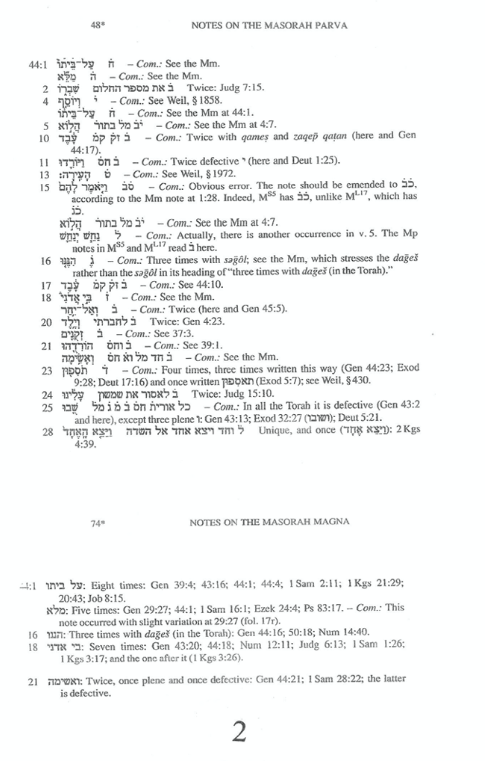 23절에서 @형식에 대한 Mp 주석은 ד, 즉 "네 번"이라고 읽으며 편집자는 이 네 가지 형태 중 세 개가 이런 식으로 기록되었지만 네 번째는 약간 다르게 기록되었다고 설명합니다. 이 네 가지 형태에 대한 모든 성경적 참고 자료는 Weil의 Masorah Gedolah 에 대한 참고 자료로 제공됩니다 . 여기서 이 네 가지 형태는 Mm 메모에 나열되어 있습니다. 25절에서 @ 형태의 편집자는 긴 Mp 주석을 번역합니다. “모든 토라에서 세 개의 plene ו를 제외하고는 결함이 있으며 다시 한 번 모든 성경 참조가 주어졌습니다.