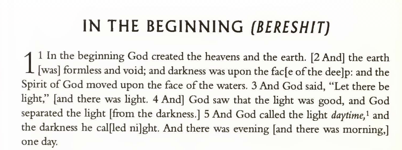 1:1 태초에 하나님이 천지를 창조하시니라. [2그리고] 땅은 혼돈하고 공허 했습니다. 흑암이 깊음 위에 있고 하나님의 신은 수면 위에 운행하시니라. 3 하나님이 이르시되 빛이 있으라 하시니 빛이 있었고 4 그 빛이 하나님의 보시기에 좋았더라 하나님이 빛을 나누사 5 하나님이 빛을 낮이라 부르시고 어둠을 밤이라 부르시니라. 저녁이 되고 아침이 되니, 어느 날이었습니다. -구글 번역 -
