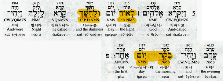 LXX: καὶ ἐκάλεσεν ὁ θεὸς τὸ φῶς ἡμέραν καὶ τὸ σκότος ἐκάλεσεν νύκτα καὶ ἐγένετο ἑσπέρα καὶ ἐγένετο πρωί ἡμέρα μία
