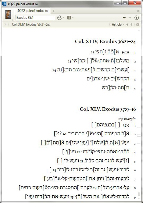 - 그리스어 단편을 포함하여 모든 성서 사해 두루마리의 새로운 필사본입니다. 로고스 필사본은 DJD 책에서 발견된 것과 실질적으로 동일하지만, DJD 책이 출판된 이후 두루마리에 대해 수행된 학문적 작업을 고려한 신선하고 전문적인 분석의 결과입니다.