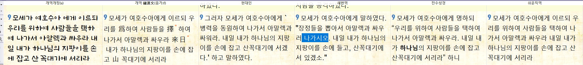 번역: 9 모세가 예수께 여짜오되 당신을 위하여 강한 사람들을 택하여 나가서 아말렉 앞에 서라 내일은 내가 산 꼭대기에 섰는데 하나님의 지팡이가 내 손에 있었느니라