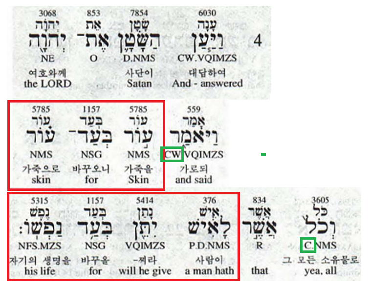 4 사탄이 여호와께 대답하여 이르되 가죽으로 가죽을 바꾸오니 사람이 그의 모든 소유물로 자기의 생명을 바꾸올 지라