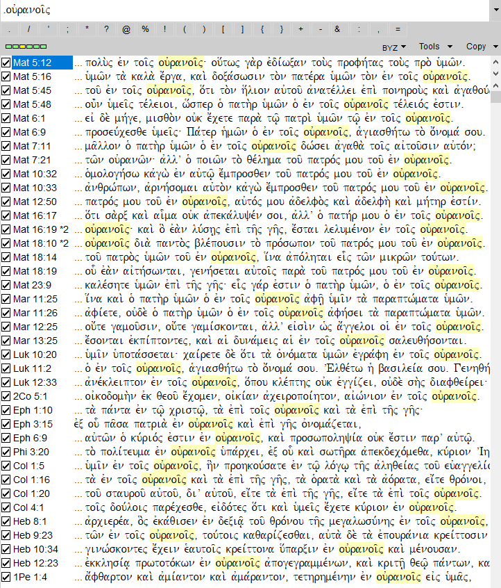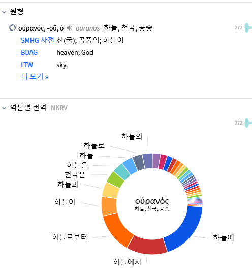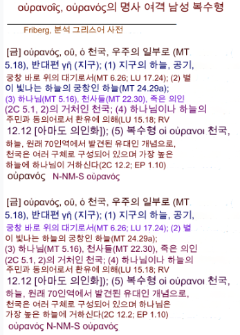 위 fnberg 분석 그리스어 사전의 내용중 "하늘, 원래 70인역에서 발견된 유대인 개념으로, 천국은 여러 구체로 구성되어 있으며, 가장 높은 하늘에 하나님이 거하신다"로 표현되어 있다. 아래는 하늘(우라노스)가 사용된 문법의 형태들과 횟수들이다. 복수의 형태로는 아래 그림처럼 4가지 형태로 성경에 등장한다.