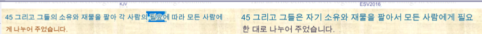 u 원본: διαμερίζω - 음역 : Diamerizo - 음성학적: dee-am-er-id'-zo - 정의: 1. 조각조각 자르다, 조각조각 자르다 2. 서로 반대되는 부분으로 나뉘다, 불일치하다, 불화하다 3. 배포하다 - 원점: G1223 및 G3307에서 - TDNT 항목: 없음 - 품사 : 동사 - Strong's: G1223 및 G3307에서; 철저하게 나누다(문자 그대로 분배에서 비유적으로 불화로): - 갈라진 부분을 나누다. 총 KJV 발생: 7 ▶ cloven, 1 행 2:3 ![]() ![]() ▶parted, 6 마 27:35(2); 막 15:24; 눅23:34; 요 19:24; 행 2:45 아래 성경 구절들은 KJV 1611년 판과 비교하여본 행 2:45이다. ![]() ![]() ![]() ![]() |
